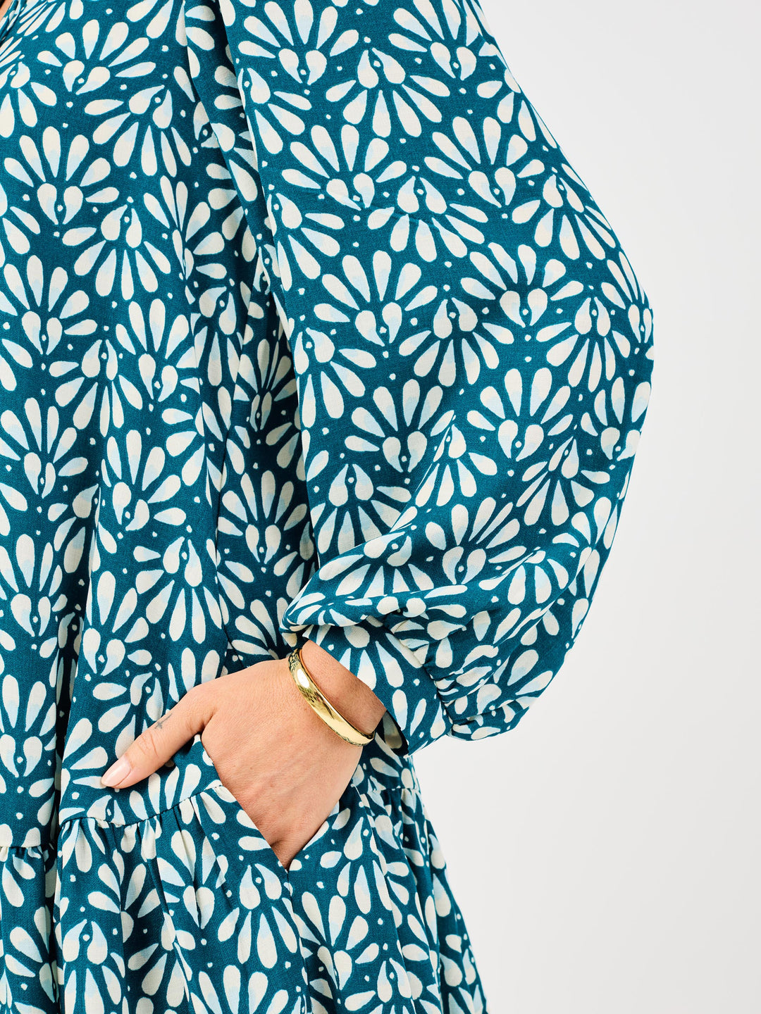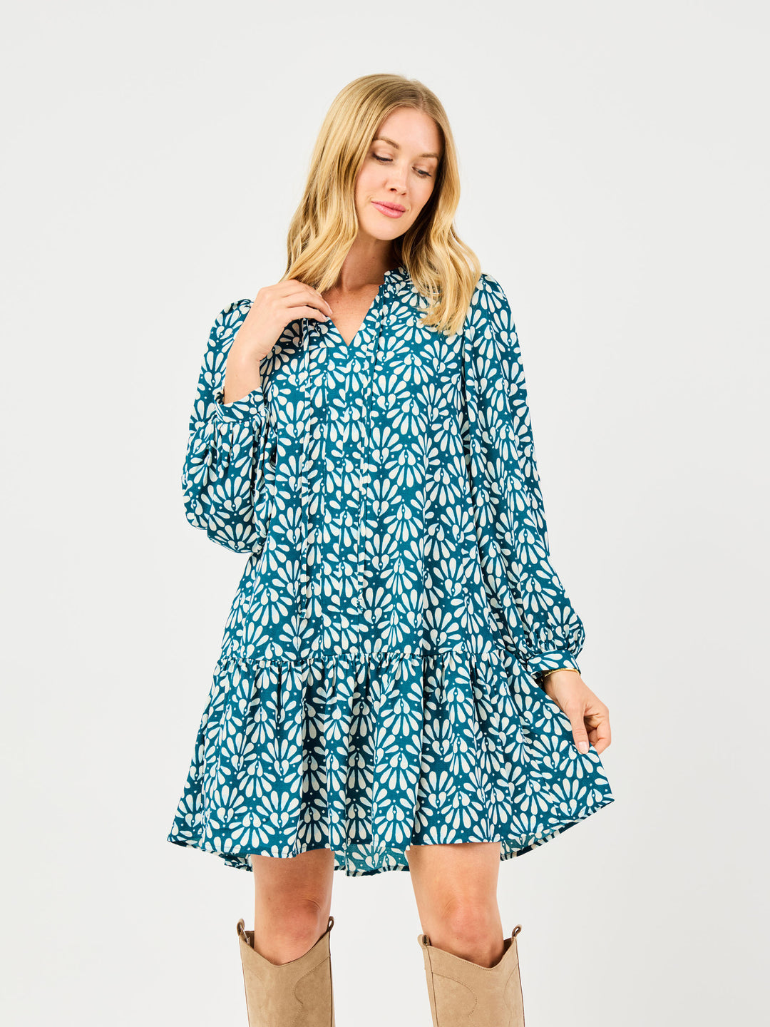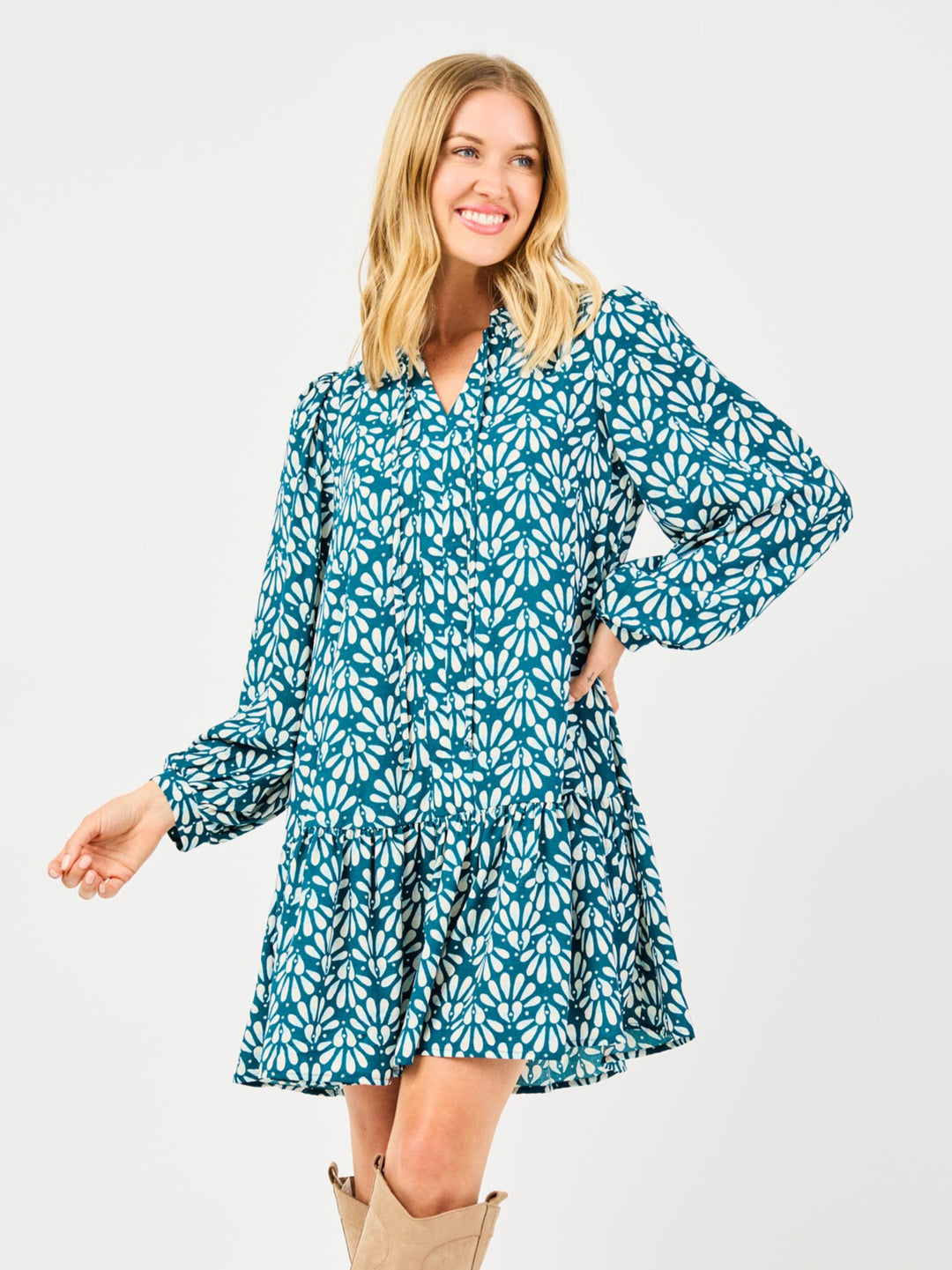 The Natasha Dress is where classic design meets modern flair. With its flattering long sleeves and a stylish double placket, this dress brings sophistication to every look. The collar band with adjustable ties adds a chic, customizable detail, while the tiered hem flows beautifully for a flattering silhouette.