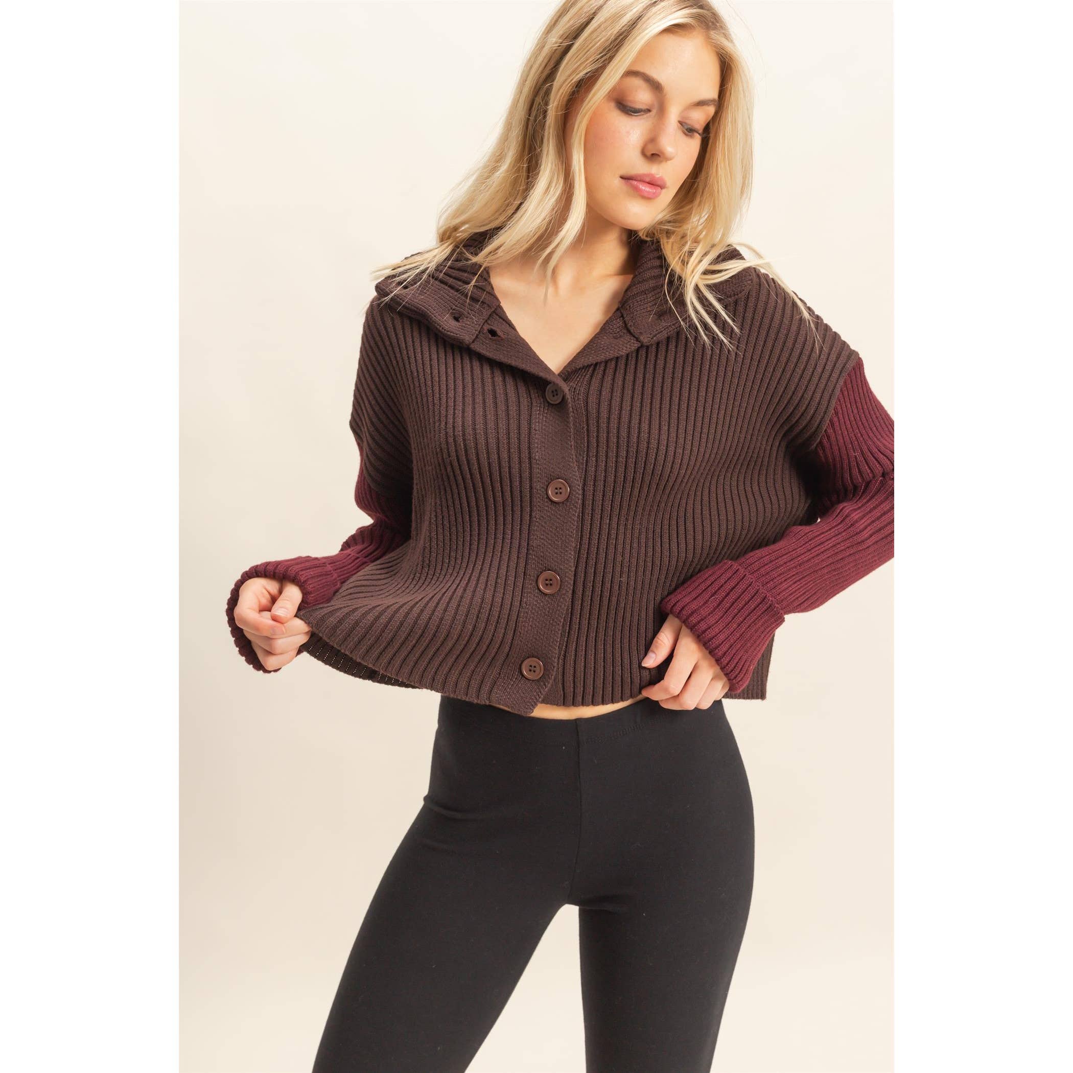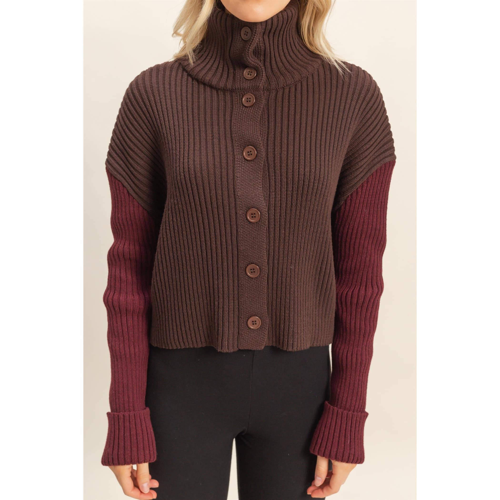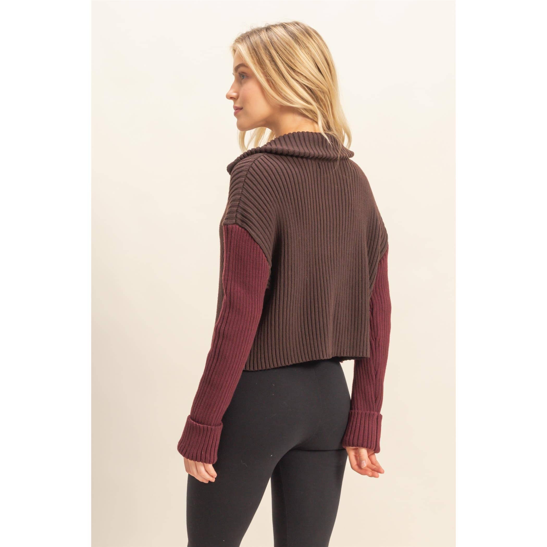 This sweater features a unique paneled design with contrasting sleeves, offering a fresh twist on the classic silhouette for a standout appearance. Perfect for transitioning between seasons, its snug fit makes it ideal for layering over collared shirts.