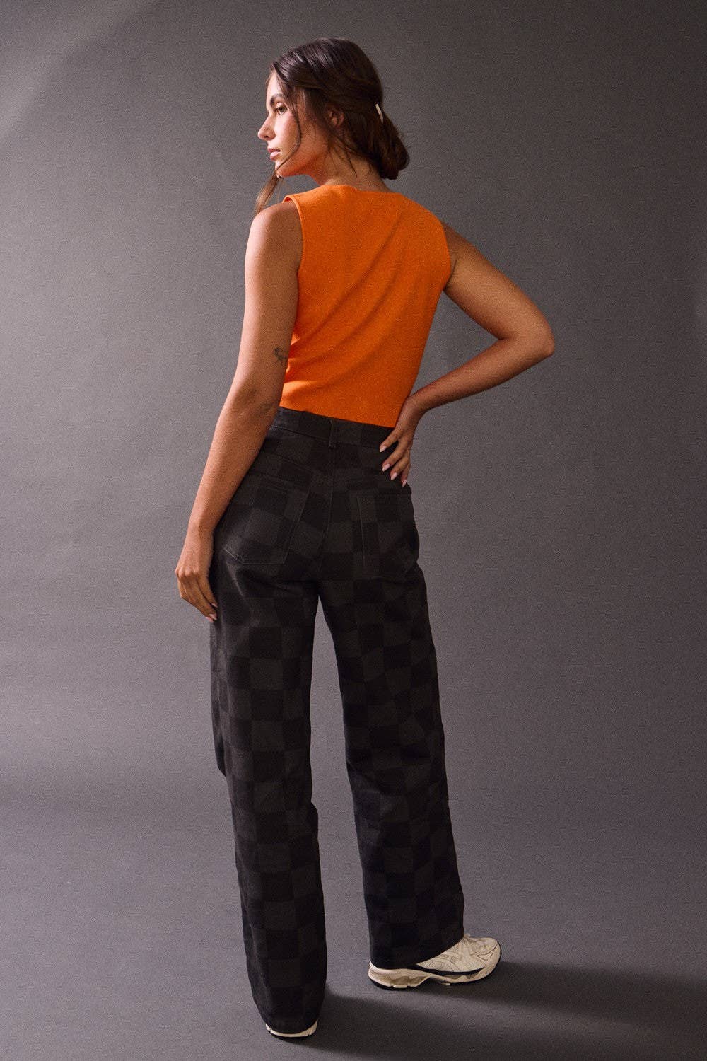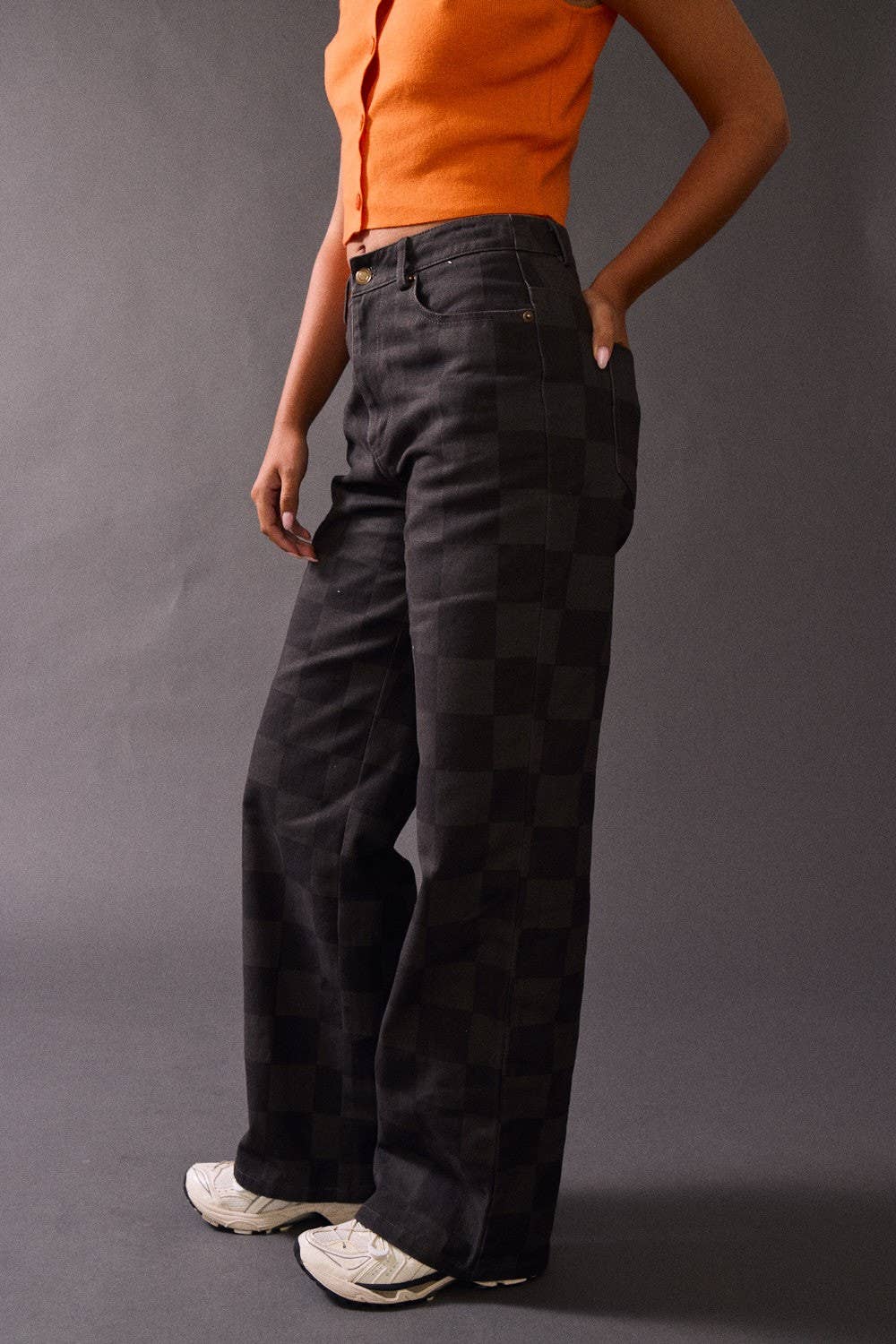 Checkered wide leg jeans, -high rise with wide-leg cut, -all over print, -classic zip fly & button, -functional front and back pockets, -relaxed fit.
